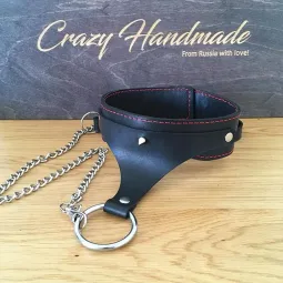 Ошейник Crazy Handmade — стильное дополнение к БДСМ образу. Ошейник декорирован кожаной вставкой с шипом и металлическим кольцом. В комплекте длинный поводок-цепочка.
